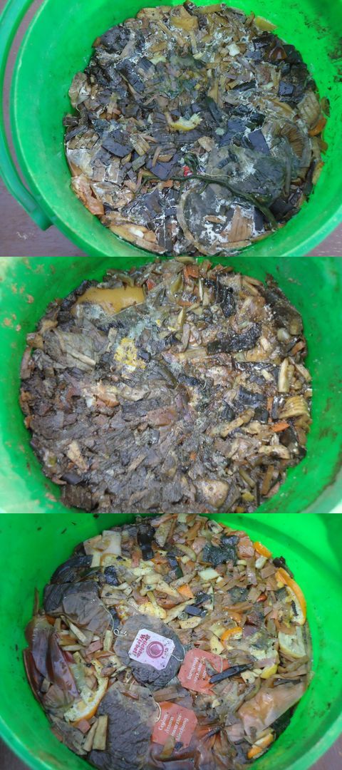 Im selbstgebauten Bokashieimer, nach sechs Wochen In Eimern, von oben nach unten: mit Hefe, mit EM1, mit Joghurt; jeweils nach vier Wochen Viele Grüße