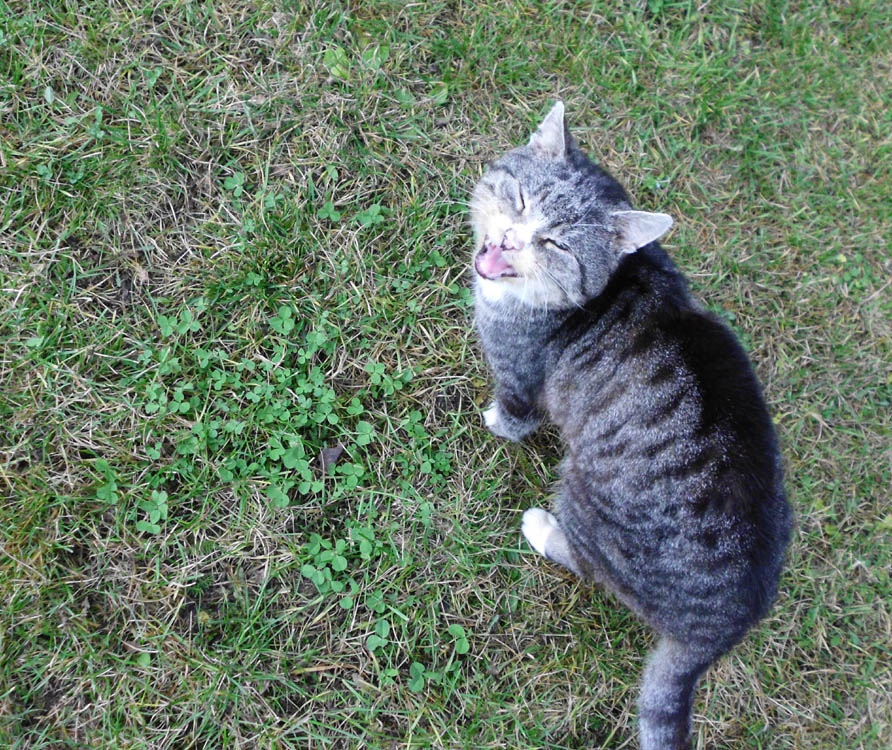 Unser Kater Flipper und etwas Weißklee im Rasen.