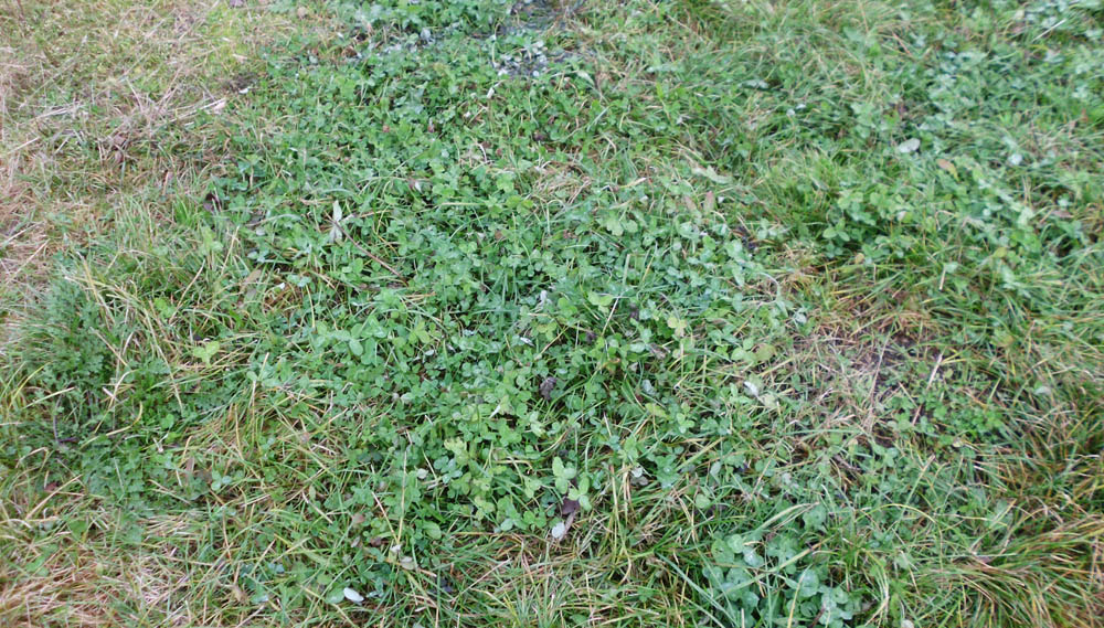 Weißklee und Rotklee in der Wiese. Grasschnitt wird bisher immer liegen gelassen außer direkt an der Terasse.