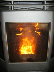 Unten die große Flamme stammt aus der Brennschale des Pelletofens, oben die beiden Flammen kommen halbrund aus dem Rand der Suppen-Dosen...