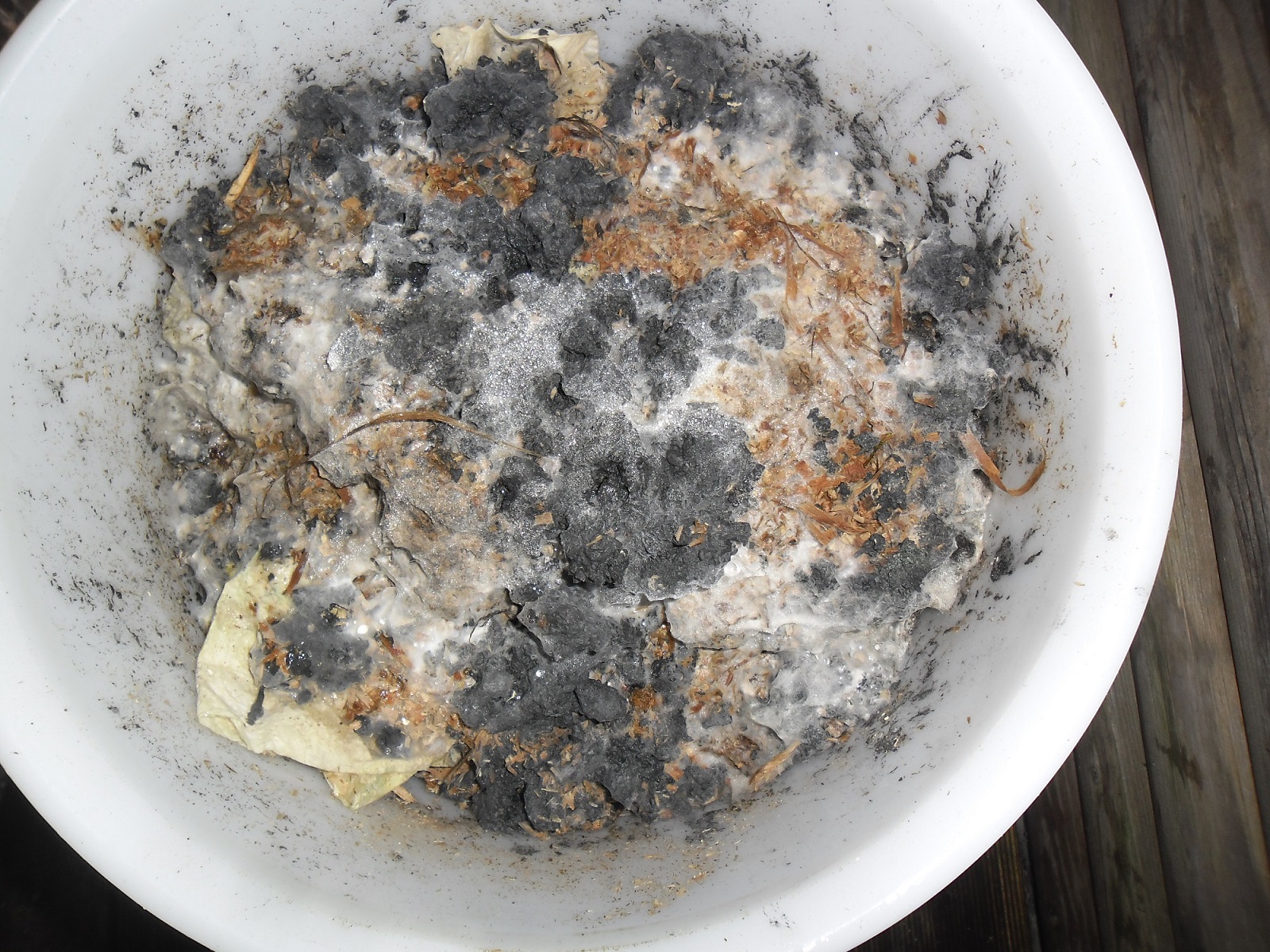 in meinem Kompostklo-Eimer, der seit einigen Wochen in der Sommerhitze fermentiert, befindet sich obendrauf eine weiße Schicht von Schimmel.