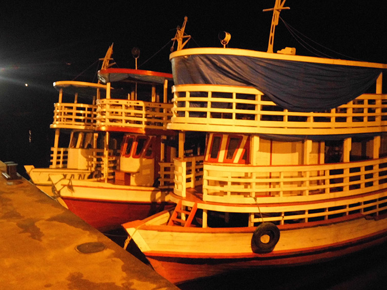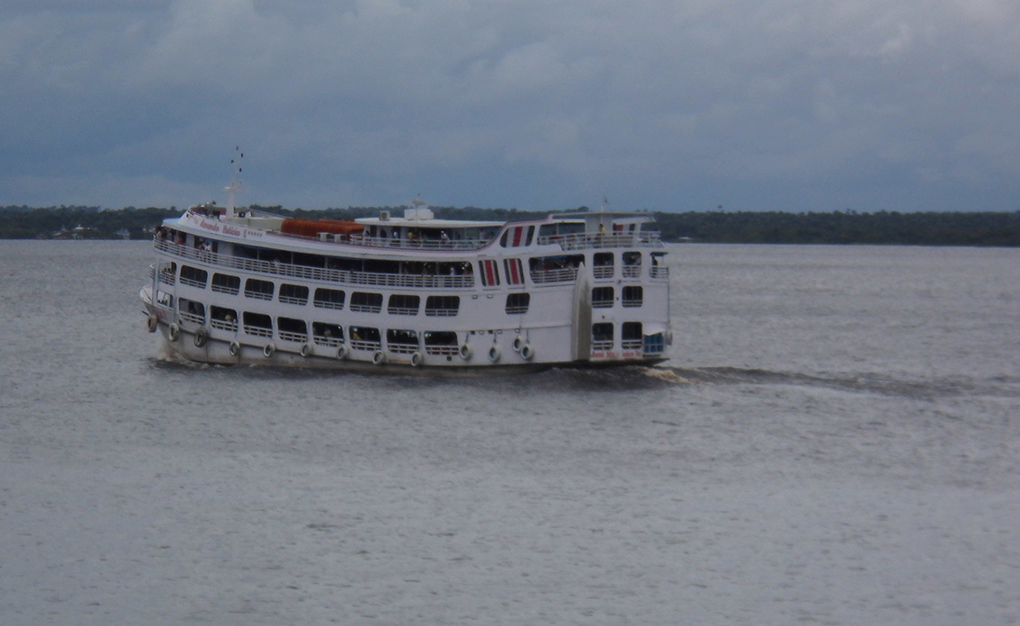 Es ist nach zwei Wochen Zeit sich von Novo Airão zu verabschieden. Auf zum Hafen und den Hängemattenfähren, in denen man Hintern an Hintern und Fuß an Kopf zu hunderten gemeinsam dahin schaukelt. Die typischen Hängemattenfähren sind breite Schiffe mit geringem Tiefgang, damit sie bei den Untiefen und Schlamminseln des Amazonas nicht stecken bleiben. Die hölzernen Schiffe für 200 Hängematten oder die noch größeren eisernen Schiffe für bis zu 800 Menschen türmen sich zwei, drei oder sogar vier Stockwerke hoch. Der perfekte Abenteuerspielplatz für unser Töchterchen, mit Bar und Küche und manchmal sogar Fernsehen für die aktuelle Telenovela. In jedem Hafen kommen Händler an Bord mit warmem Essen und allerlei Kleinigkeiten zum Verkaufen. Auf hoher See würden die Schiffe wohl Schwierigkeiten bekommen, aber auf dem Amazonas ohne Wellen und mit wenig Wind sind sie perfekt angepasst.