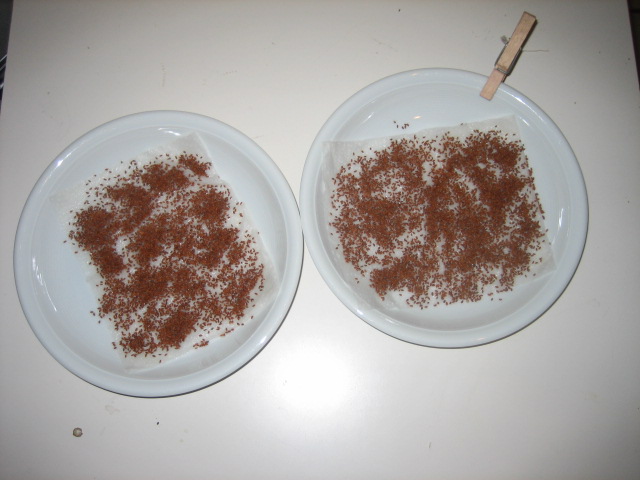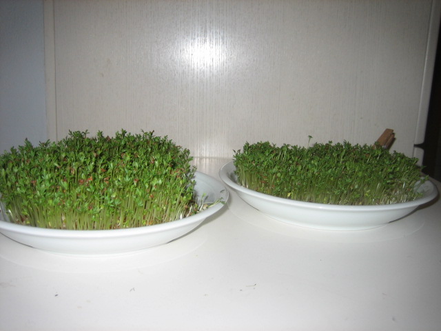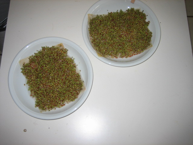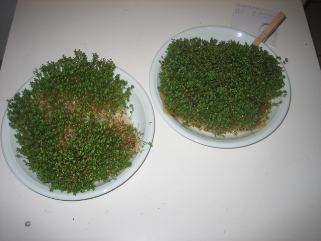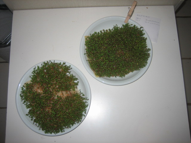 Gute Idee, der Kressetest! So wie ich das auf den Bildern sehe, ist das Wachstum auf dem Waescheklammer-teller dichter, kompakter und wohl auch gruener als auf dem Vergleichsteller.