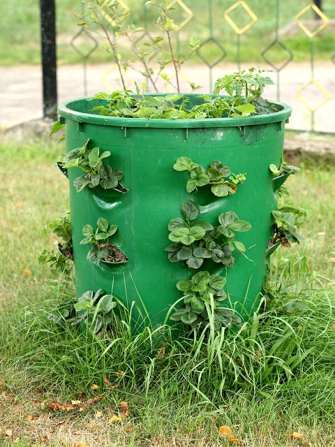 Ein Hochbeet aus einer alten Regentonne, mit Löchern im Boden und mit kleinen Pflanzlöchern an den Seiten. Es ist wichtig in der Mitte eine Säule mit reinem Kies oder einem Bewässerungsrohr zu machen, damit das Wasser gut überall hinkommt.