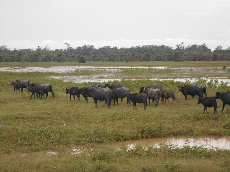 Wir wären gern noch geblieben, aber der Amazonas ruft. Mit der großen Hängemattenfähre dampften wir gemütlich von Santarém flußabwärts, 1000 km in zwei Tagen, erst nach Belém und dann nach Marajó. Marajó ist eine topfebene Insel in der Flußmündung des Amazonas so groß wie die Schweiz. Marajó wird von der Diktatur des Wassers beherrscht erkannte Priester Giovanni Gallo, der das erste und einzigartige Museum für indianische Keramikkunst ins Leben rief. Regelmäßige Überschwemmungen und ständiger Regen bestimmen den Rhythmus der Menschen auf der Flußinsel. Marajó ist berühmt für seine vielen Wasserbüffel und für endlose Überschwemmungswiesen. Der Wasserbüffel wurde erst von den Europäern eingeführt. In Amazonien gab es vorher keine domestizierbaren Tiere. Fünf Tage lang aßen wir Büffelsteak, Büffelbutter und Büffelkäse. Reis und Bohnen gehören zu jedem Essen in Brasilien dazu. Ich hatte mich schon gefragt wo der ganze Reis herkommt. Jetzt weiß ich es. Marajó! Auf der beschwerlichen Fahrt zum Indianermuseum sind wir stundenlang an großen Reisfeldern vorbei gefahren, mit dutzenden Mähdrescher auf dem Feld und alle paar Minuten kam uns ein Riesenlaster mit Reis entgegen.