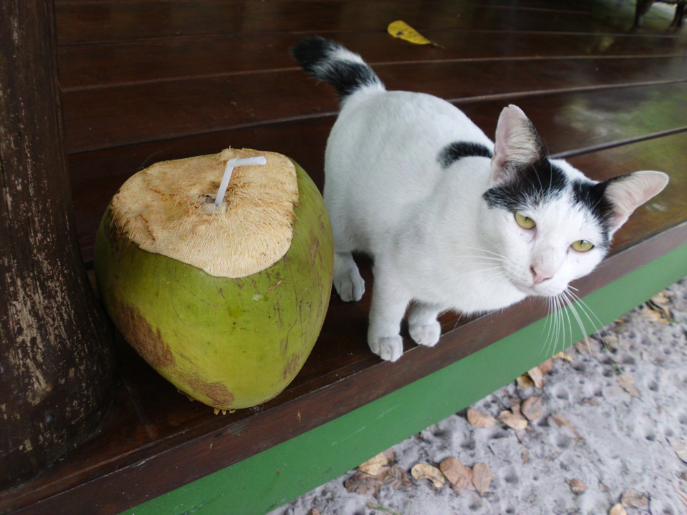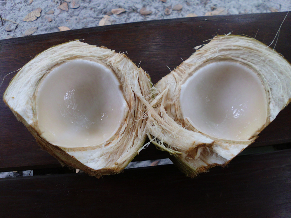 Das Wasser der Kokosnuss ist leider nur frisch gut zu bekommen. Wann immer man in warmen Gegenden ist, gehört das tägliche trinken einer Kokosnuss zum Pflichtprogramm. Kokosnüsse frisch vom Baum sind randvoll gefüllt mit einem halben bis einem Liter leicht süßem Kokosnusswasser. Meist nicht teurer als eine Flasche Wasser, ist das Kokoswasser so steril und ideal zusammengesetzt, dass es sogar als intravenöse Lösung direkt ins Blut gegeben werden kann. 100 %ig keimfrei, voller Mineralien, Enzyme und Vitamine und mit ganz wenig Zucker. Mit einer Kokosnuss am Pool liegen ist der Inbegriff von Urlaub. Für die Einheimischen ist die Kokosnuss oft so gewöhnlich und billig, dass man sie nötigen muss einem eine Kokosnuss zu besorgen und aufzumachen. Es lohnt sich und manchmal lernen die Einheimischen sogar von den Touristen Kokosnusswasser statt Coca Cola zu trinken.