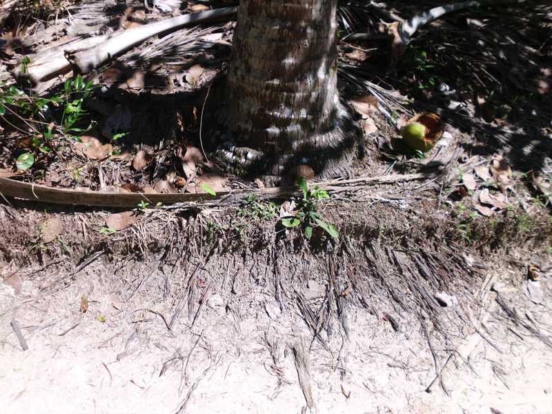 Das Wurzelgeflecht der Koksnuss ist wie lauter Strippen und reicht über viele Meter. Die Kokospalme hält den Boden trotz Regen und Wind fest, verhindert Erosion und fängt alle Nährstoffe ab die im Grundwasser und anderweitig vorbei kommen.