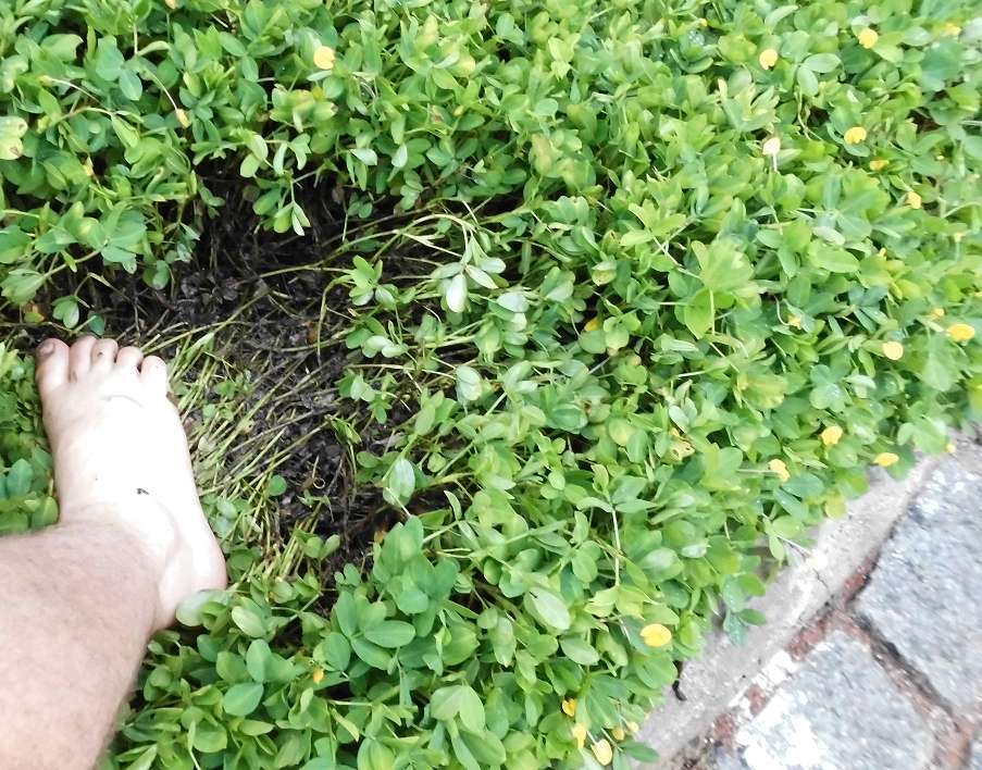 Ab und zu werde ich gefragt, wie man Unterwuchs in den Tropen/Subtropen realisieren kann, in Thailand, Indonesien oder Paraguay usw. . Klee funktioniert nicht, es ist schlicht zu warm. Der Boden liegt trotz Bokashi und Kompost sofort wieder rostrot und steinhart da. Mein Tip: Augen auf! Meist wird man irgendwo in der Gegend eine Ecke, eine Pflanze finden, wo der Boden bedeckt, feucht und locker ist. Meine Favorit hier in Brasilien ist Erdnussgras (grama amendoim). Wächst noch schöner als Klee, ist immergrün, bleibt flach und bindet Stickstoff. Immer mehr São Paulistaner nehmen es statt Gras zur Begrünung. Erdnussgras kann man nur schwer und teuer säen, am besten wird es gepflanzt. 1-4 Pflanzen pro m² und es bildet bald eine dichte Decke. Yara ganz oben übrigens auch vor Erdnussgras und hier im Suchbild (Wer findet die Socke?).