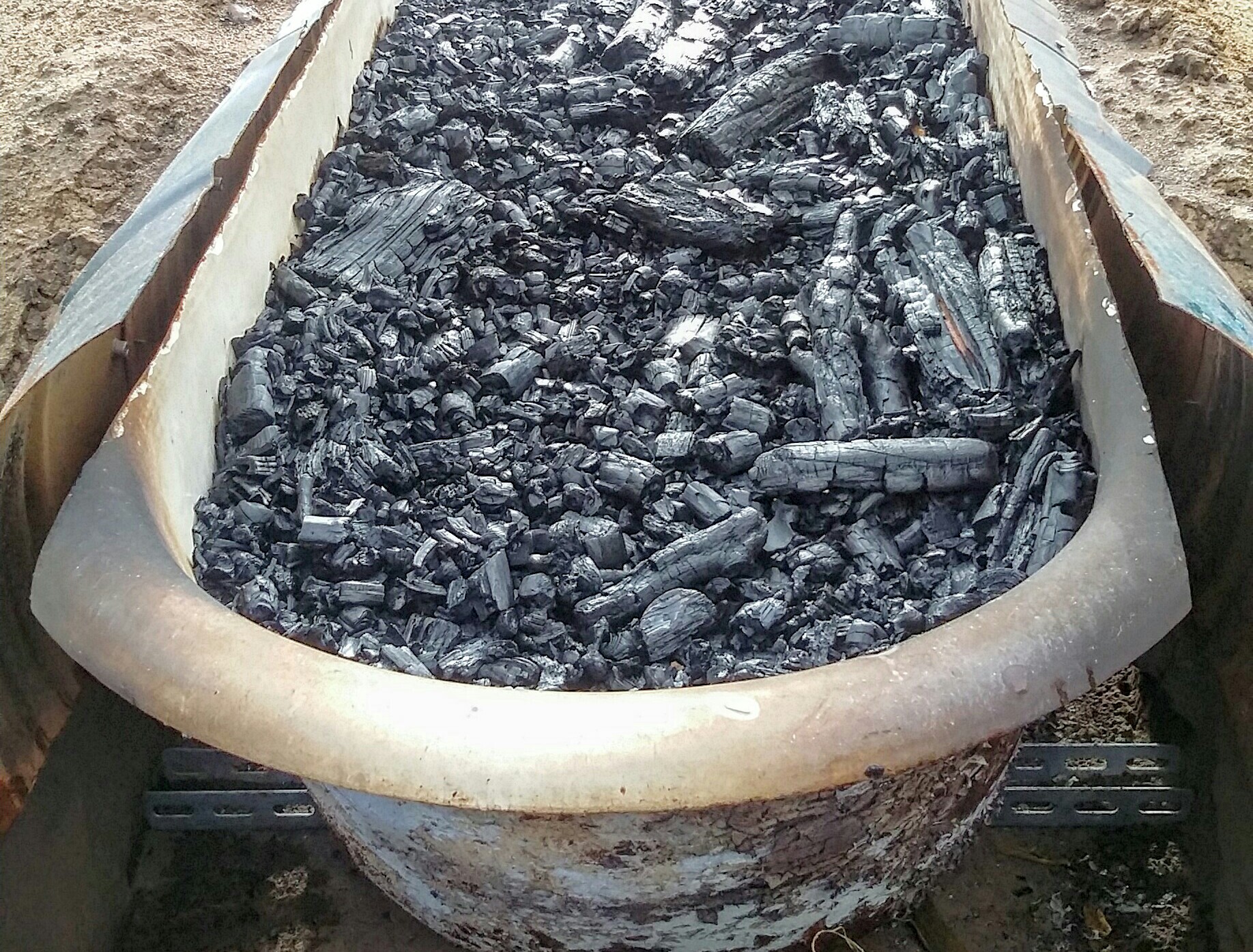 Qualitativ gute Kohle entsteht bei Temperaturen ab 540 Grad aufwärts, denke ich. Um das zu schaffen, habe ich mit meiner Erfahrung der Verkokung mittels TLUD, den ich ursprünglich sogar in Steinwolle eingepackt hatte, dann aber mit gleichem Ergebnis ins Erdloch gestellt habe, diese Erkenntnis auf den Kon Tiki übernommen und das Teil gleichfalls verbuddelt. Die Leitbleche habe ich an einen Metallrahmen geschraubt, der in seinen Abmaßen gut 10 cm links und rechts und hinten Abstand zur Wanne lässt. Vorn an der Wannenschräge habe ich den Rand noch dran, dafür aber gleich unter dem Rand einen zusätzlichen Schlitz. Die Temperaturen erhöhen sich, weil die Luft sich von unten auf dem Weg nach oben ungemein vorwärmt. Keine Energieverluste zulassen! Auf die Idee mit der Wanne bin ich gekommen, weil so ein gusseisernen Teil ja kaum kaputtbar zu kriegen ist. Blechgeschichten aus Tonnen usw. sterben nach etwa 10 bis 15 Vorgängen. Die Wanne im Erdloch ist längs in unser hier dominierenden Windrichtung ausgerichtet. Ganz einfache Kon Tiki-Lösung ist ein liegendes 200 Liter-Fass, bei dem man ein ovales Loch rausschneidet. Keine Idee von mir. Das Teil ins Erdloch müsste sogar ohne Luftleitbleche funktionieren.
