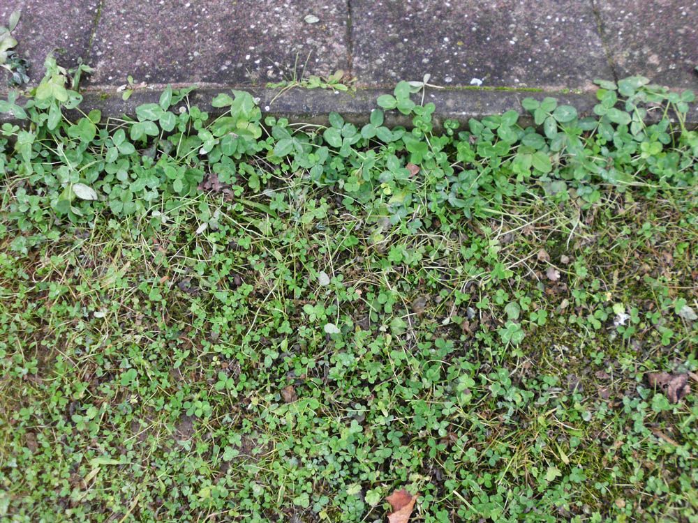 Weißklee und Rotklee am Weg. Rotklee ist der mit den größeren Blättern und der deutlicheren Zeichnung auf den Blättern. Man sieht es natürlich auch an den Blüten, wenn sie blühen und Weißklee bleibt flach und Rotklee wird 50 cm hoch.