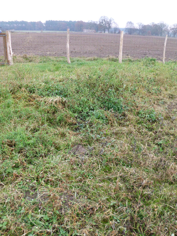 Unsere Wiese nach hinten raus. Das hellgrüne ist Luzerne, das etwas dunklere Rotklee und dahinter unser neu gebauter Zaun aus den ewig haltenden Rubinienpfählen und einem Wildzaungeflecht.
