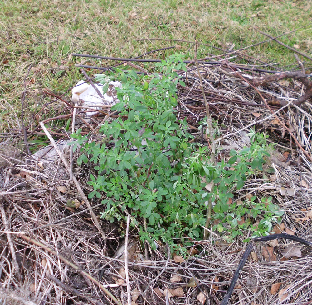 Luzerne an einem gepflanzten, jetzt blattlosen Gingko. Gemulcht mit Pappe und Zweigen.