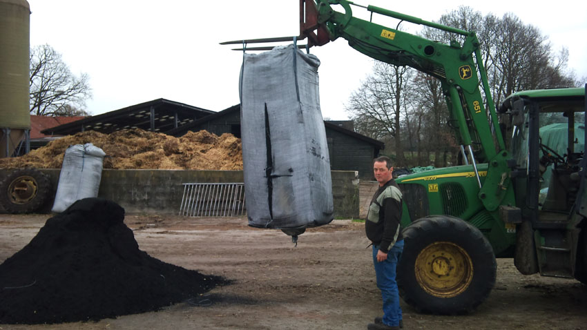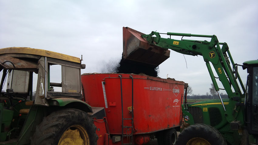 Gemischt werden kann EM und Holzkohle wahrscheinlich sogar besser mit Radlader auf einer Betonfläche. Hier ein Versuch mit Futtermischwagen.