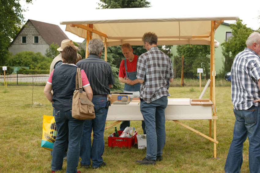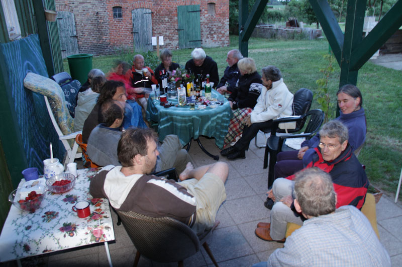 In Groß Pankow war es also überwiegend trocken und wir hatten einen wilden Jahrmarkt mit allen möglichen Ständen. Von Seil drehen und EM-Kosmetik über Naturbauhaus Schwerin (Bauberatung http://www.naturbauhaus.de), Demeterprodukte (Käse, Quark, Wurst http://www.siebengiebelhof.de), Froximmun (Entgiftung mit Zeolith http://bni-biene.de/17.html), Fostac (Stromspargerät, http://www.strom-elektrosmog.de), Rohkost, Heilen mit Matrixenergie (http://www.matrix-energetics.net/anwend ... e/687.html) bis zu grünen Smoothies und natürlich unserem EM und TriaTerra-Stand (http://www.triaterra.de). Ganz entspannt ab 14:00 Uhr mit indischem EM-Kaffe und indischem Menü. Vom indischen Essen habe ich nichts mehr abbekommen. Es müssen also eine ganze Menge Leute da gewesen sein, die im Garten flaniert sind und sich in den Sitzecken ausgeruht und ausgetauscht haben. Das klappt sehr schön. Mal keine Veranstaltung mit Vorträgen im Halbstundentakt sondern nur gemütlicher Austausch in gemütlichen Sitzen und persönliche Beratung an den vielen Ständen. Das können wir weiter so machen.