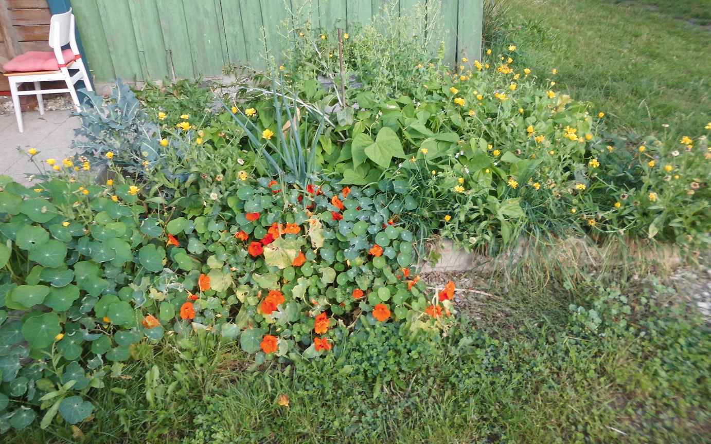 Hokkaidokürbisse, hier im Erdbeerbeet, machen einfach Spass. Man muß sie nicht schälen, sie schmecken besser als Kartoffeln, lassen sich aber genauso wie Kartoffeln zubereiten, haben jede Menge Carotinoide, sind bis Februar einfach lagerfähig und wachsen mit etwas Urin und Mulch überall. Hier noch eine Nahaufnahme von der Hefeblume auf unserem EM-Ansatz. Mein Quadratbeet hat zum Teil schon die dritte Ernte und ist wie immer gut überwuchert mit Kapuzinerkresse, Kohl, Ringelblumen, Dauerzwiebeln, Wasabi, Schnittlauch, Salat, Bohnen und vielem mehr.